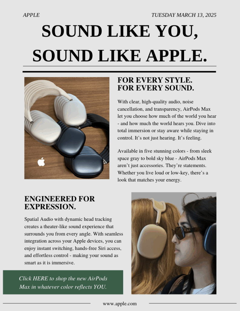 AirPods Max aren’t just about tech specs – they’re about expression. They’re built for the way you move, the way you focus, the way you disconnect and reconnect. With detailed audio, thoughtful features, and a look that feels personal, AirPods Max fit seamlessly into your life – whether you’re deep in focus, on the move, or just taking a moment for yourself. No two people sound the same, and that’s exactly the point. This isn’t one-size-fits-all audio. This is sound, worn your way.
